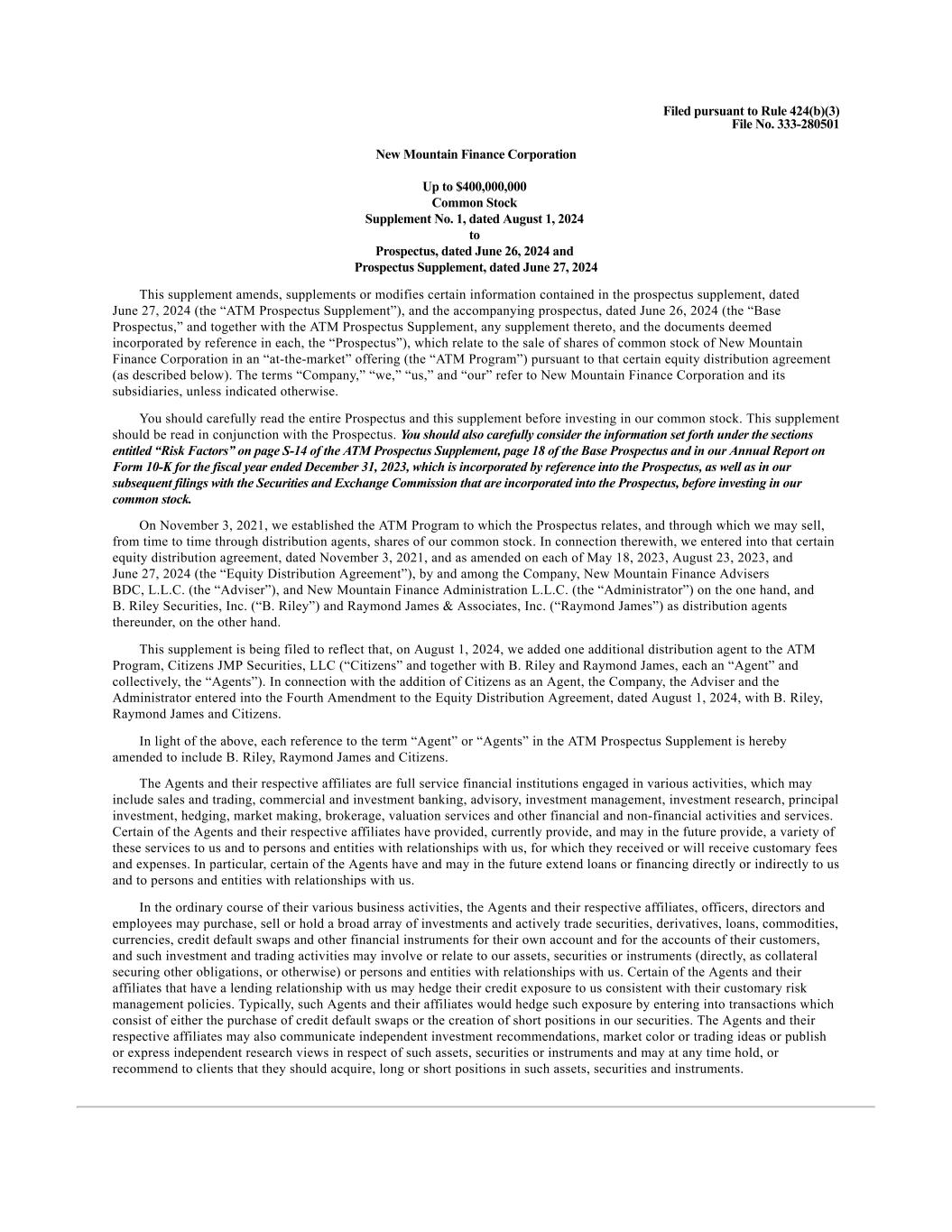 Filed pursuant to Rule 424(b)(3) File No. 333-280501 New Mountain Finance Corporation Up to $400,000,000 Common Stock Supplement No. 1, dated August 1, 2024 to Prospectus, dated June 26, 2024 and Prospectus Supplement, dated June 27, 2024 This supplement amends, supplements or modifies certain information contained in the prospectus supplement, dated June 27, 2024 (the “ATM Prospectus Supplement”), and the accompanying prospectus, dated June 26, 2024 (the “Base Prospectus,” and together with the ATM Prospectus Supplement, any supplement thereto, and the documents deemed incorporated by reference in each, the “Prospectus”), which relate to the sale of shares of common stock of New Mountain Finance Corporation in an “at-the-market” offering (the “ATM Program”) pursuant to that certain equity distribution agreement (as described below). The terms “Company,” “we,” “us,” and “our” refer to New Mountain Finance Corporation and its subsidiaries, unless indicated otherwise. You should carefully read the entire Prospectus and this supplement before investing in our common stock. This supplement should be read in conjunction with the Prospectus. You should also carefully consider the information set forth under the sections entitled “Risk Factors” on page S-14 of the ATM Prospectus Supplement, page 18 of the Base Prospectus and in our Annual Report on Form 10-K for the fiscal year ended December 31, 2023, which is incorporated by reference into the Prospectus, as well as in our subsequent filings with the Securities and Exchange Commission that are incorporated into the Prospectus, before investing in our common stock. On November 3, 2021, we established the ATM Program to which the Prospectus relates, and through which we may sell, from time to time through distribution agents, shares of our common stock. In connection therewith, we entered into that certain equity distribution agreement, dated November 3, 2021, and as amended on each of May 18, 2023, August 23, 2023, and June 27, 2024 (the “Equity Distribution Agreement”), by and among the Company, New Mountain Finance Advisers BDC, L.L.C. (the “Adviser”), and New Mountain Finance Administration L.L.C. (the “Administrator”) on the one hand, and B. Riley Securities, Inc. (“B. Riley”) and Raymond James & Associates, Inc. (“Raymond James”) as distribution agents thereunder, on the other hand. This supplement is being filed to reflect that, on August 1, 2024, we added one additional distribution agent to the ATM Program, Citizens JMP Securities, LLC (“Citizens” and together with B. Riley and Raymond James, each an “Agent” and collectively, the “Agents”). In connection with the addition of Citizens as an Agent, the Company, the Adviser and the Administrator entered into the Fourth Amendment to the Equity Distribution Agreement, dated August 1, 2024, with B. Riley, Raymond James and Citizens. In light of the above, each reference to the term “Agent” or “Agents” in the ATM Prospectus Supplement is hereby amended to include B. Riley, Raymond James and Citizens. The Agents and their respective affiliates are full service financial institutions engaged in various activities, which may include sales and trading, commercial and investment banking, advisory, investment management, investment research, principal investment, hedging, market making, brokerage, valuation services and other financial and non-financial activities and services. Certain of the Agents and their respective affiliates have provided, currently provide, and may in the future provide, a variety of these services to us and to persons and entities with relationships with us, for which they received or will receive customary fees and expenses. In particular, certain of the Agents have and may in the future extend loans or financing directly or indirectly to us and to persons and entities with relationships with us. In the ordinary course of their various business activities, the Agents and their respective affiliates, officers, directors and employees may purchase, sell or hold a broad array of investments and actively trade securities, derivatives, loans, commodities, currencies, credit default swaps and other financial instruments for their own account and for the accounts of their customers, and such investment and trading activities may involve or relate to our assets, securities or instruments (directly, as collateral securing other obligations, or otherwise) or persons and entities with relationships with us. Certain of the Agents and their affiliates that have a lending relationship with us may hedge their credit exposure to us consistent with their customary risk management policies. Typically, such Agents and their affiliates would hedge such exposure by entering into transactions which consist of either the purchase of credit default swaps or the creation of short positions in our securities. The Agents and their respective affiliates may also communicate independent investment recommendations, market color or trading ideas or publish or express independent research views in respect of such assets, securities or instruments and may at any time hold, or recommend to clients that they should acquire, long or short positions in such assets, securities and instruments.
