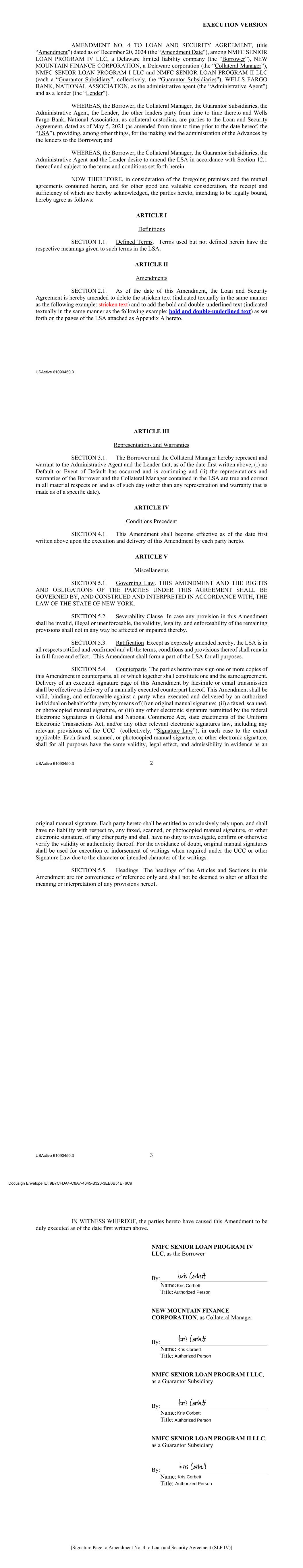 EXECUTION VERSION USActive 61090450.3 AMENDMENT NO. 4 TO LOAN AND SECURITY AGREEMENT, (this “Amendment”) dated as of December 20, 2024 (the “Amendment Date”), among NMFC SENIOR LOAN PROGRAM IV LLC, a Delaware limited liability company (the “Borrower”), NEW MOUNTAIN FINANCE CORPORATION, a Delaware corporation (the “Collateral Manager”), NMFC SENIOR LOAN PROGRAM I LLC and NMFC SENIOR LOAN PROGRAM II LLC (each a “Guarantor Subsidiary”, collectively, the “Guarantor Subsidiaries”), WELLS FARGO BANK, NATIONAL ASSOCIATION, as the administrative agent (the “Administrative Agent”) and as a lender (the “Lender”). WHEREAS, the Borrower, the Collateral Manager, the Guarantor Subsidiaries, the Administrative Agent, the Lender, the other lenders party from time to time thereto and Wells Fargo Bank, National Association, as collateral custodian, are parties to the Loan and Security Agreement, dated as of May 5, 2021 (as amended from time to time prior to the date hereof, the “LSA”), providing, among other things, for the making and the administration of the Advances by the lenders to the Borrower; and WHEREAS, the Borrower, the Collateral Manager, the Guarantor Subsidiaries, the Administrative Agent and the Lender desire to amend the LSA in accordance with Section 12.1 thereof and subject to the terms and conditions set forth herein. NOW THEREFORE, in consideration of the foregoing premises and the mutual agreements contained herein, and for other good and valuable consideration, the receipt and sufficiency of which are hereby acknowledged, the parties hereto, intending to be legally bound, hereby agree as follows: ARTICLE I Definitions SECTION 1.1. Defined Terms. Terms used but not defined herein have the respective meanings given to such terms in the LSA. ARTICLE II Amendments SECTION 2.1. As of the date of this Amendment, the Loan and Security Agreement is hereby amended to delete the stricken text (indicated textually in the same manner as the following example: stricken text) and to add the bold and double-underlined text (indicated textually in the same manner as the following example: bold and double-underlined text) as set forth on the pages of the LSA attached as Appendix A hereto. USActive 61090450.3 2 ARTICLE III Representations and Warranties SECTION 3.1. The Borrower and the Collateral Manager hereby represent and warrant to the Administrative Agent and the Lender that, as of the date first written above, (i) no Default or Event of Default has occurred and is continuing and (ii) the representations and warranties of the Borrower and the Collateral Manager contained in the LSA are true and correct in all material respects on and as of such day (other than any representation and warranty that is made as of a specific date). ARTICLE IV Conditions Precedent SECTION 4.1. This Amendment shall become effective as of the date first written above upon the execution and delivery of this Amendment by each party hereto. ARTICLE V Miscellaneous SECTION 5.1. Governing Law. THIS AMENDMENT AND THE RIGHTS AND OBLIGATIONS OF THE PARTIES UNDER THIS AGREEMENT SHALL BE GOVERNED BY, AND CONSTRUED AND INTERPRETED IN ACCORDANCE WITH, THE LAW OF THE STATE OF NEW YORK. SECTION 5.2. Severability Clause In case any provision in this Amendment shall be invalid, illegal or unenforceable, the validity, legality, and enforceability of the remaining provisions shall not in any way be affected or impaired thereby. SECTION 5.3. Ratification Except as expressly amended hereby, the LSA is in all respects ratified and confirmed and all the terms, conditions and provisions thereof shall remain in full force and effect. This Amendment shall form a part of the LSA for all purposes. SECTION 5.4. Counterparts The parties hereto may sign one or more copies of this Amendment in counterparts, all of which together shall constitute one and the same agreement. Delivery of an executed signature page of this Amendment by facsimile or email transmission shall be effective as delivery of a manually executed counterpart hereof. This Amendment shall be valid, binding, and enforceable against a party when executed and delivered by an authorized individual on behalf of the party by means of (i) an original manual signature; (ii) a faxed, scanned, or photocopied manual signature, or (iii) any other electronic signature permitted by the federal Electronic Signatures in Global and National Commerce Act, state enactments of the Uniform Electronic Transactions Act, and/or any other relevant electronic signatures law, including any relevant provisions of the UCC (collectively, “Signature Law”), in each case to the extent applicable. Each faxed, scanned, or photocopied manual signature, or other electronic signature, shall for all purposes have the same validity, legal effect, and admissibility in evidence as an USActive 61090450.3 3 original manual signature. Each party hereto shall be entitled to conclusively rely upon, and shall have no liability with respect to, any faxed, scanned, or photocopied manual signature, or other electronic signature, of any other party and shall have no duty to investigate, confirm or otherwise verify the validity or authenticity thereof. For the avoidance of doubt, original manual signatures shall be used for execution or indorsement of writings when required under the UCC or other Signature Law due to the character or intended character of the writings. SECTION 5.5. Headings The headings of the Articles and Sections in this Amendment are for convenience of reference only and shall not be deemed to alter or affect the meaning or interpretation of any provisions hereof. [Signature Page to Amendment No. 4 to Loan and Security Agreement (SLF IV)] IN WITNESS WHEREOF, the parties hereto have caused this Amendment to be duly executed as of the date first written above. NMFC SENIOR LOAN PROGRAM IV LLC, as the Borrower By: ____________________________________ Name: Title: NEW MOUNTAIN FI