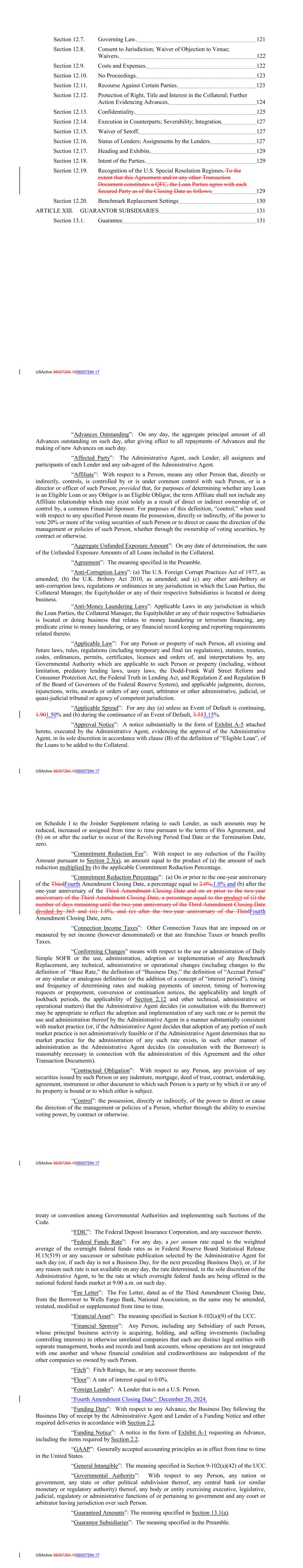 Section 12.7. Governing Law. 121 Section 12.8. Consent to Jurisdiction; Waiver of Objection to Venue; Waivers. 122 Section 12.9. Costs and Expenses. 122 Section 12.10. No Proceedings. 123 Section 12.11. Recourse Against Certain Parties. 123 Section 12.12. Protection of Right, Title and Interest in the Collateral; Further Action Evidencing Advances. 124 Section 12.13. Confidentiality. 125 Section 12.14. Execution in Counterparts; Severability; Integration. 127 Section 12.15. Waiver of Setoff. 127 Section 12.16. Status of Lenders; Assignments by the Lenders. 127 Section 12.17. Heading and Exhibits. 129 Section 12.18. Intent of the Parties. 129 Section 12.19. Recognition of the U.S. Special Resolution Regimes. To the extent that this Agreement and/or any other Transaction Document constitutes a QFC, the Loan Parties agree with each Secured Party as of the Closing Date as follows: 129 Section 12.20. Benchmark Replacement Settings 130 ARTICLE XIII. GUARANTOR SUBSIDIARIES 131 Section 13.1. Guarantee 131 USActive 56057294.1556057294.17 “Advances Outstanding”: On any day, the aggregate principal amount of all Advances outstanding on such day, after giving effect to all repayments of Advances and the making of new Advances on such day. “Affected Party”: The Administrative Agent, each Lender, all assignees and participants of each Lender and any sub-agent of the Administrative Agent. “Affiliate”: With respect to a Person, means any other Person that, directly or indirectly, controls, is controlled by or is under common control with such Person, or is a director or officer of such Person; provided that, for purposes of determining whether any Loan is an Eligible Loan or any Obligor is an Eligible Obligor, the term Affiliate shall not include any Affiliate relationship which may exist solely as a result of direct or indirect ownership of, or control by, a common Financial Sponsor. For purposes of this definition, “control,” when used with respect to any specified Person means the possession, directly or indirectly, of the power to vote 20% or more of the voting securities of such Person or to direct or cause the direction of the management or policies of such Person, whether through the ownership of voting securities, by contract or otherwise. “Aggregate Unfunded Exposure Amount”: On any date of determination, the sum of the Unfunded Exposure Amounts of all Loans included in the Collateral. “Agreement”: The meaning specified in the Preamble. “Anti-Corruption Laws”: (a) The U.S. Foreign Corrupt Practices Act of 1977, as amended; (b) the U.K. Bribery Act 2010, as amended; and (c) any other anti-bribery or anti-corruption laws, regulations or ordinances in any jurisdiction in which the Loan Parties, the Collateral Manager, the Equityholder or any of their respective Subsidiaries is located or doing business. “Anti-Money Laundering Laws”: Applicable Laws in any jurisdiction in which the Loan Parties, the Collateral Manager, the Equityholder or any of their respective Subsidiaries is located or doing business that relates to money laundering or terrorism financing, any predicate crime to money laundering, or any financial record keeping and reporting requirements related thereto. “Applicable Law”: For any Person or property of such Person, all existing and future laws, rules, regulations (including temporary and final tax regulations), statutes, treaties, codes, ordinances, permits, certificates, licenses and orders of, and interpretations by, any Governmental Authority which are applicable to such Person or property (including, without limitation, predatory lending laws, usury laws, the Dodd-Frank Wall Street Reform and Consumer Protection Act, the Federal Truth in Lending Act, and Regulation Z and Regulation B of the Board of Governors of the Federal Reserve System), and applicable judgments, decrees, injunctions, writs, awards or orders of any court, arbitrator or other administrative, judicial, or quasi-judicial tribunal or agency of competent jurisdiction. “Applicable Spread”: For any day (a) unless an Event of Default is continuing, 1.901.50% and (b) during the continuance of an Event of Default, 3.553.15%. “Approval Notice”: A notice substantially in the form of Exhibit A-5 attached hereto, executed by the Administrative Agent, evidencing the approval of the Administrative Agent, in its sole discretion in accordance with clause (B) of the definition of “Eligible Loan”, of the Loans to be added to the Collateral. USActive 56057294.1556057294.17 on Schedule I to the Joinder Supplement relating to such Lender, as such amounts may be reduced, increased or assigned from time to time pursuant to the terms of this Agreement, and (b) on or after the earlier to occur of the Revolving Period End Date or the Termination Date, zero. “Commitment Reduction Fee”: With respect to any reduction of the Facility Amount pursuant to Section 2.3(a), an amount equal to the product of (a) the amount of such reduction multiplied by (b) the applicable Commitment Reduction Percentage. “Commitment Reduction Percentage”: (a) On or prior to the one-year anniversary of the ThirdFourth Amendment Closing Date, a percentage equal to 2.0%,1.0% and (b) after the one-year anniversary of the Third Amendment Closing Date and on or prior to the two-year anniversary of the Third Amendment Closing Date, a percentage equal to the product of (i) the number of days remaining until the two-year anniversary of the Third Amendment Closing Date divided by 365 and (ii) 1.0%, and (c) after the two-year anniversary of the ThirdFourth Amendment Closing Date, zero. “Connection Income Taxes”: Other Connection Taxes that are imposed on or measured by net income (however denominated) or that are franchise Taxes or branch profits Taxes. “Conforming Changes” means with respect to the use or administration of Daily Simple SOFR or the use, administration, adoption or implementation of any Bench
